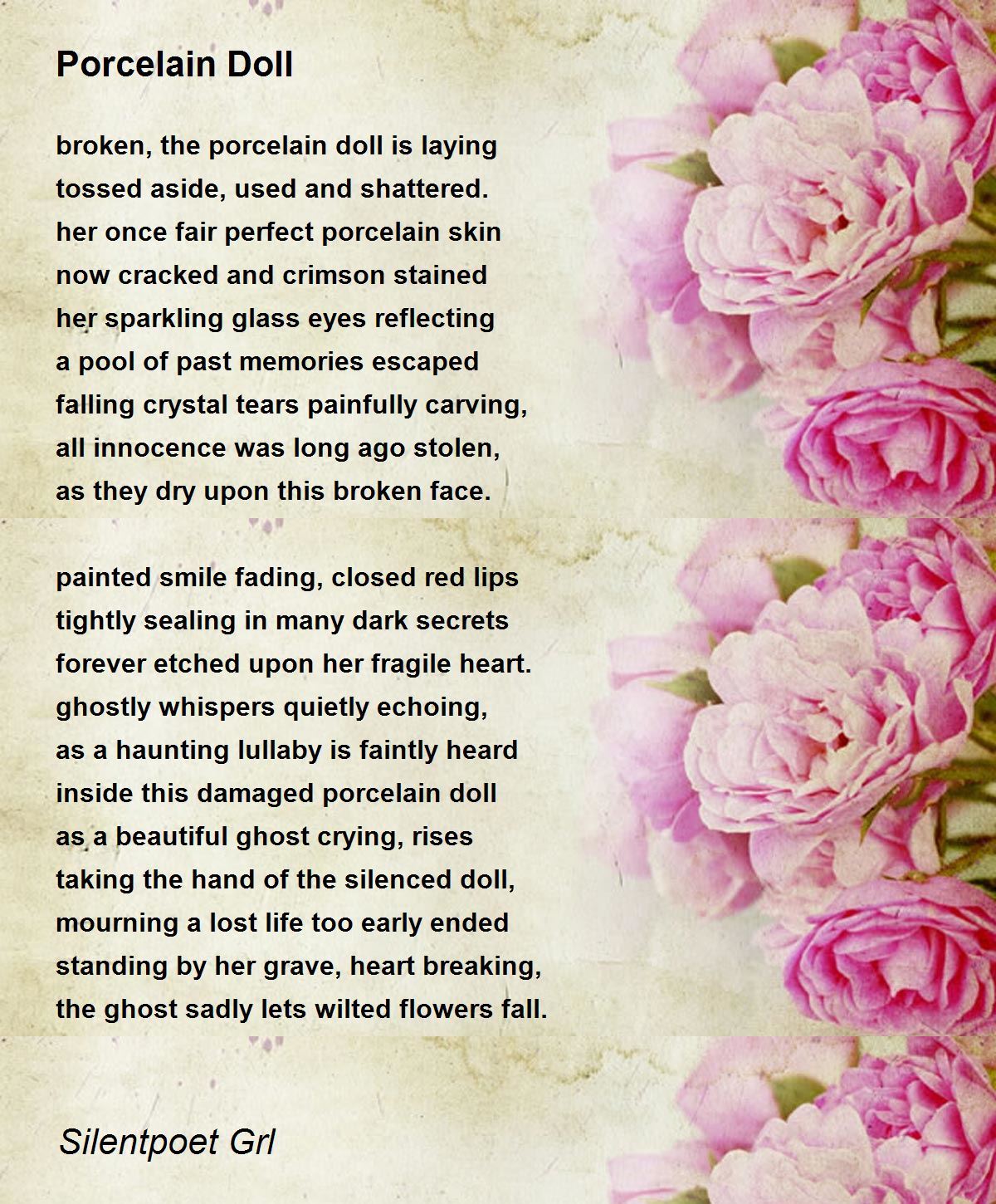 The Porcelain Doll by ShellyBean Stanowski The Porcelain Doll Poem Porcelain Doll Poem Share poems, lyrics, short stories and. like a porcelain doll, she dresses herself for the evening her vulnerability wrapped in a silky cloth, she dances like a dusk. to the porcelain doll’s intelligence, they say she is beautiful or scary― never smart. Sadness, depression / about depression. here’s a fab original poem written by a gl reader. Porcelain Doll Poem.